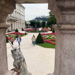 The other musical claim to fame of course is Salzburg being the city where ‘The Sound of Music was filmed. You can take ‘the tour’ should you so desire, but we chose to wander through many sites easily recognisable from the film and I kept expecting Julie Andrews and the Von Trapp children to appear around the corner at any moment, singing Do-Ray-Me! This was particularly true in the Mirabellgarten and the Pegasus fountain. In the grounds of the Schloss Mirabelle is a very grand Aviary built by one of the Archbishops to house his collection of singing birds. They were apparently in glorious full song today and so we went to take a look. A bit of a disappointment! The birdsong was on tape and an art installation of modern type was on display to represent our feathered friends. I’ll upload a photo so you can appraise the artistry!