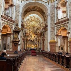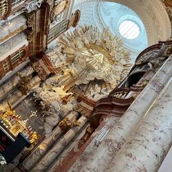 We moved on to Karlskirche, a striking baroque church it is difficult to describe. All I will say is it is a vision in white and gold. I will include photos which will tell the story better than I ever could. To our surprise it is dedicated to Charles Borromeo of the Isola Bella and Madre family, the patron saint of the fight against the plague and was built in 1715-1757 to thank God for delivering Vienna from the epidemic of 1713. We knew a little of Charles Borromeo and his sainthood from our visit early in the year to the Italian Lakes, but not enough to not be surprised at his coming into the picture in Vienna.