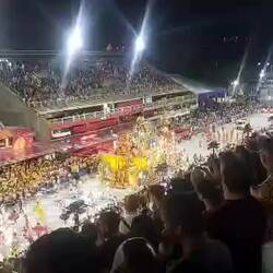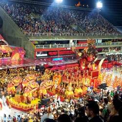 And the sambadrome was absolutely amazing. All of the samba schools of Rio compete in a massive stadium, they dress up to absolute nines in the classic carnaval colours, feathers, glitter, and dance their way through this massive arena with huge, brightly-coloured, parade floats and the scale of it is hard to describe. It is absolutely amazing and one of our highlights here for sure.