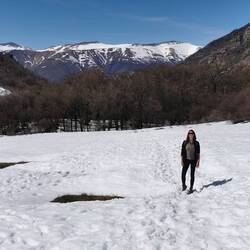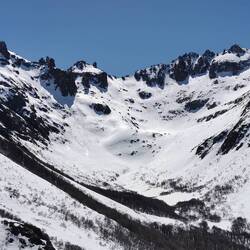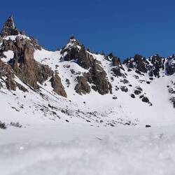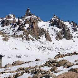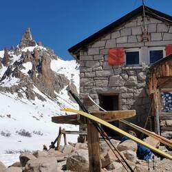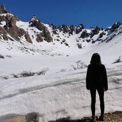 Zum Abschluss in Bariloche nutzen wir erneut das tolle Wetter und starten eine Wanderung zum Refugio Frey. Dazu fahren wir mit dem Bus in den Skiort Villa Catedral, in dem sich auch heute viele Wintersportler versammeln, um auf den Pisten rund ums Dorf die Sau raus zu lassen. Wir wandern stattdessen hinein in die Berge. Ganz gemächlich geht es los und wir genießen die wunderbare Aussicht. Nach einigen Höhenmetern wird uns allerdings klar, warum der Weg im Oktober noch als schwer deklariert ist. Der Schnee wird immer mehr und insgesamt wirds immer rutschiger. Alles nicht so schlimm, wären da nicht die teilweise steilen Abgründe direkt neben dem Weg. Wir kämpfen uns dennoch durch, auch wenn die letzten Kilometer im tiefen Schnee wirklich anstrengend sind. Oben angekommen sind wir uns einig, dass sich die Mühe absolut gelohnt hat, denn die Landschaft ist spektakulär - vor allem mit dem vielen Schnee. Die Hütte ist "ausgegraben", sodass wir nebenan die tatsächlich Schneedicke sehen können.