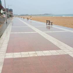 Ganz in der Nähe finde ich in Strandnähe zwischen hohen Häusern einem Stellplatz. Ist für heute die perfekte Kombination. Tatsächlich sind auch noch Plätze frei und ich parke ein. Anschließend gehe ich am Strand entlang mit dem Wind im Rücken zum anderem Ende. Der Sand weht über den Stand, die Jacke bläht sich auf und der Wind schiebt mich vorwärts. Selbst die Möwen sitzen am Boden und warten. Zurück kann ich über die schöne Promenade von Laredo gehen, die Häuser geben etwas Windschutz.