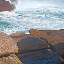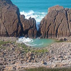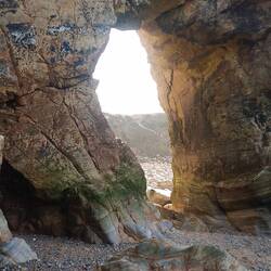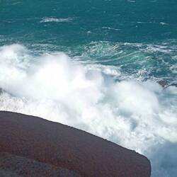Unten arbeitet das Meer gegen den Felsen und bei Flut mit starken Wellen kommen aus den Löchern Wasserfontänen geschossen ( da hätte ich Sonntag was zu sehen bekommen). Jetzt ist Ebbe, aber der Atem ist deutlich hörbar. Mit jeder Welle wird Luft durch die Röhren gedrückt und wieder zurück gesaugt. Könnte eine Vorlage für Darth Vader gewesen sein 😀. Ich habe mal versucht, es aufzunehmen.