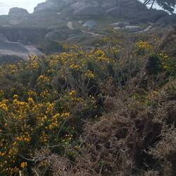 Hier haben schon früher die Leute mit natürlichem Wetterschutz gearbeitet und ihre Häuser auf der Windschattenseite an den Felsen gebaut. Urbretonisch liest man, ich denke, es war einfach praktisch, da hier permanent ein Westwind weht. Aber schön anzusehen ist es, wobei es schon verwundert, wenn am Ende von "nichts" so ein Haus steht und davor dann plötzlich ein Parkplatz mit Höhenbeschränkungen etc. auftaucht...