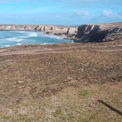 Eigentlich ist das ein Parkplatz zwischen 2 Stränden, aber die Lage ist mega. Leicht erhöht mit tollem Meerblick lasse ich mich einfangen von der tollen Atmosphäre und gehe an den Strand. Nach einer Weile kehre ich zurück zum Bus und genieße erstmal einen Kaffee. Weiterfahren, nächster Strand, bleiben, noch was an der Küste langlaufen? Hmmm, der Parkplatz ist kein offizieller Stellplatz, aber ein Surfhotspot und die meisten übernachten auch hier. Im Sommer berichten viele von nächtlichen Räumungsaktionen aber nur im Zeitraum Juni bis August .Ich entscheide mich, erst einmal zu bleiben und nehme den tollen Küstenweg zu einem Aussichtspunkt. Ist etwas weiter als gedacht, aber toll und hat sich total gelohnt.
