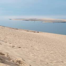 Toller Blick von hier oben rüber zum Cap Ferret und auf den Atlantik im Hintergrund. Diee Düne ist mit Ihrem Ausmaßen schon beeindruckend. 106 m hoch und 2,9 km lang. Davor bei Ebbe Sandbänke, einfach schön.