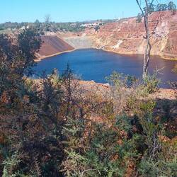 Weiter geht es dann nach Mina de Sāo Domingos. Sobald man Mértola verlassen hat, ist man wieder im Nichts. Gleiche leere Landschaft, mal rechts, mal links, mal hoch, mal runter. Ein ehemaliger Kupfer und Erzabbauort erwartet mich, an dem bis in die 60 er 6.000 Leute gewohnt haben. In einfachen Reihenhäusern, die größtenteils erhalten sind und dank eines Architekturprojektes jetzt als Ferienwohnungen dienen, denn es wohnen nur noch 600 Menschen hier. Ein größerer Badesee und ein paar Bergbaukrater mit Wasser sorgen für Urlaubsfeeling. Am Badesee kann man nicht parken, ich laufe ein Stück am Kratersee, aber die Wege sind schlecht. Auch hier ist es so ruhig, dass ich hier nicht allzu lange bleibe.