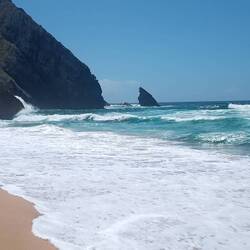 Gehen Mittag treffen wir uns und machen einen gemeinsamen Ausflug ans Meer. Da ich den Bus dabei habe und die Küste inzwischen etwas kenne, suche ich einen kleinen, sehr schönen und etwas versteckt gelegenen Strand an der Westküste heraus und wir verbringen einen schönen Strandtag zusammen. Keine 50 km entfernt, relativ leer, genau richtig. Der Praia da Adraga. Schöne Mischung zwischen Meer, Strand und Felsen.Der Atlantik zeigt sich von seiner schönen Seite. Tolle Wellen, tolle Brandung, türkisfarbenes Wasser, allerdings auch mit viel Kraft. Baden ist da was für Mutige, aber Abkühlung ist garantiert. Zum Abend hin fahren wir zurück nach Lissabon, kämpfen uns durch den Berufsverkehr und sind alle ein wenig geschafft und von der Sonne "verwöhnt".