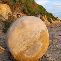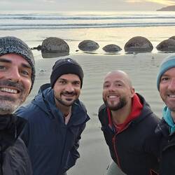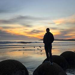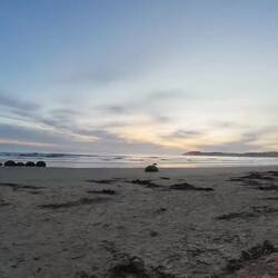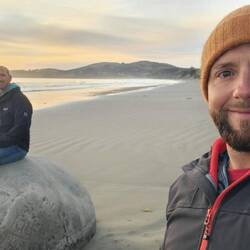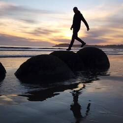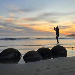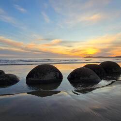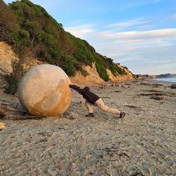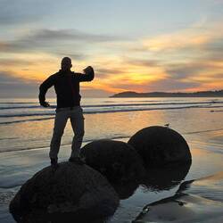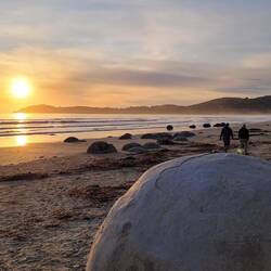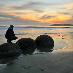 Wir fahren die 30 Minuten im Morgengrauen zu den Moeraki Boulders im Südosten der Südinsel.