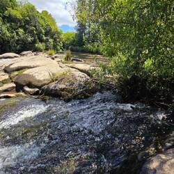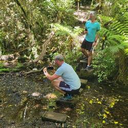 Voller Vorfreude stürmen wir also aus dem Camper in Richtung River. Nach 3 Minuten zu Fuss erreichen wir auch schon unser Ziel... Etwas unglaubwürdig schauen wir uns an und verstehen die Welt nicht mehr. Wir blicken auf einen kleinen Fluss der gemütlich den Berg hinunter fliesst. Kein Wasserfall, keine reissende Strömung und definitiv auch keine Sehenswürdigkeit. Wir müssen lachen über diese Szene und stellen uns vor wie Anwohner aus der Nähe diesen Mythos ins Leben gerufen haben um doofe Touristen wie uns zu veräppeln.