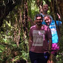 Wie die grössten Touristen stolpern wir Meter für Meter dichter in den Wald, Tom wohlgemerkt immer noch mit seinen flip-flops.