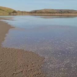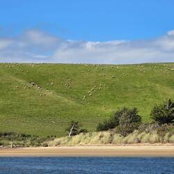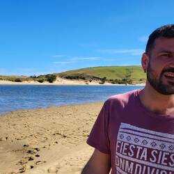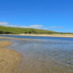 Wir befinden uns zwar am Ufer einer Bucht, zwei vorgelagerte Inseln und die wahrscheinliche Ebbe sorgen aber dafür, dass sich auf den zirka 500 Metern von hier bis zu den Inseln ein breites Sandwatt mit einem Fluss erstreckt, welcher sich ins Ladesinnere schlängelt. Wir laufen also über das Watt in der Annahme, den Fluss durchwaten zu können, der uns vom Beach trennt. Fehlanzeige. Am Fluss angekommen zieht Fabi entschlossen seine kurze Hose so hoch, wie es nur geht und stapft los. Zusammen mit Thomas wollen sie über Sandbänke die weniger tiefen Stellen im Fluss finden. "Gaht nööd!" rufen sie uns zu. Samet mag eh nicht in das Glibberwasser voller Tierchen und Algen.