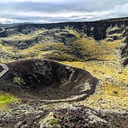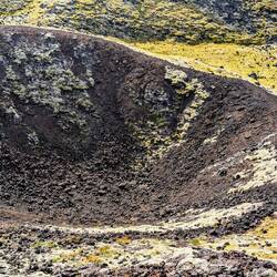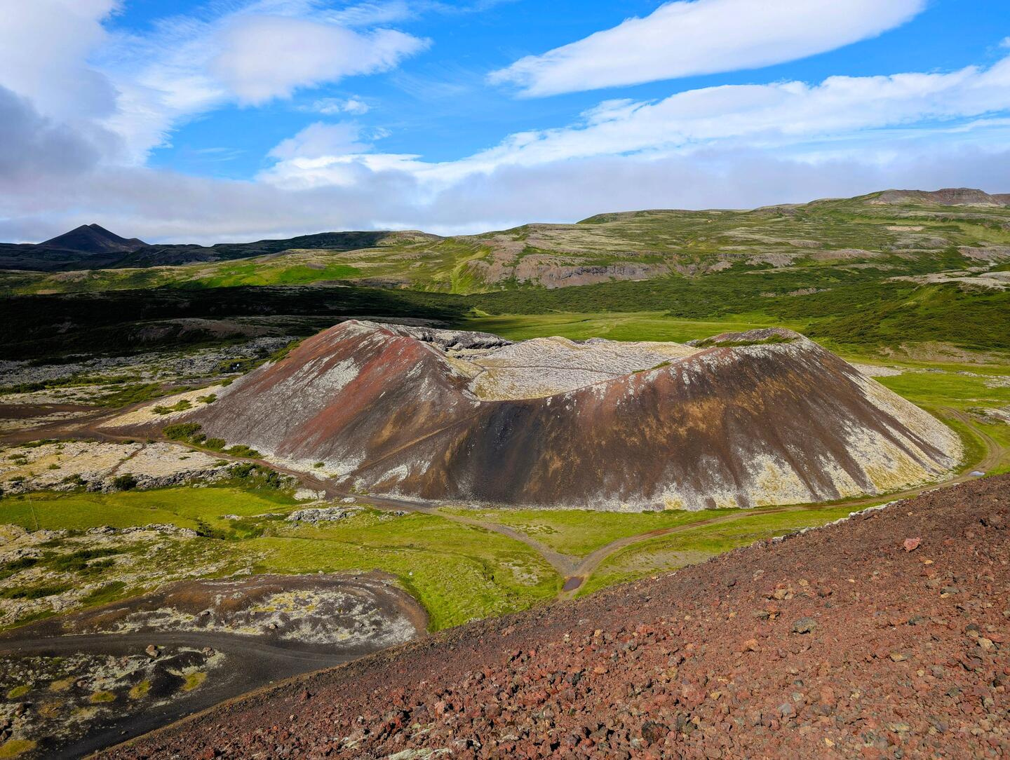 Einige markante Vulkankrater dominieren die Landschaft bei Bifröst. Sie bilden den östlichen Endpunkt eines der längsten Vulkansysteme Islands. Der Krater Grábrók besteht aus vulkanischer Schlacke.