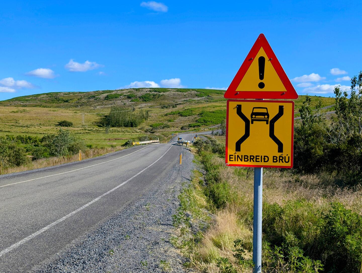 Die meisten Brücken auf den Nebenstraßen sind einspurig. Mit dem Schild Einbreid Brú wird darauf hingewiesen.