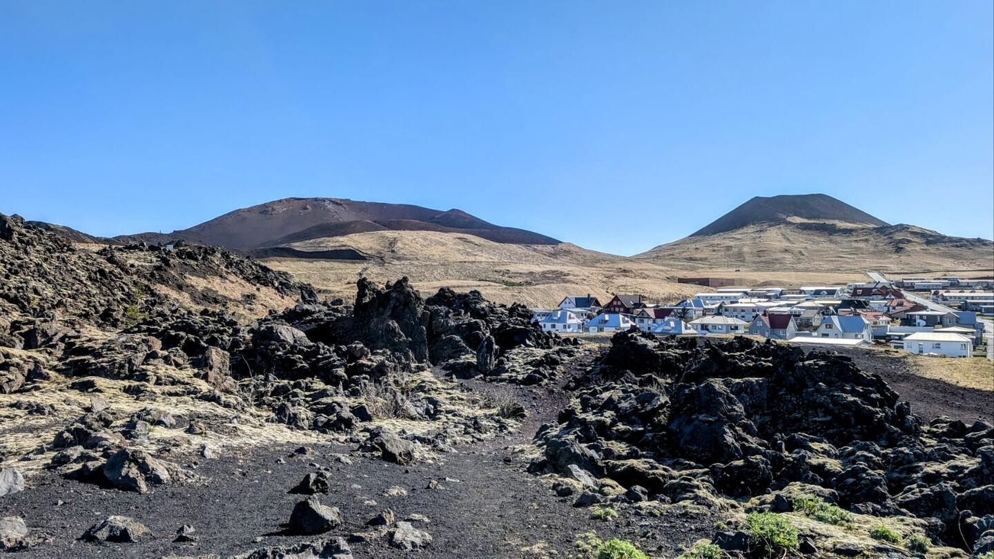 Beim Ausbruch des Eldfell 1973 (linker Krater) wurden in Heimaey über 400 Häuser unter dem Lavastrom vergraben.