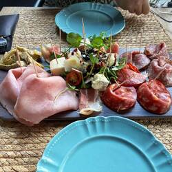 Oké oké, de bbq is wel even aan geweest voor twee worstjes en een stukje sparerib maar verder Italiaanse vleeswaren, olijven, pepertjes met roomkaas en kaas.
