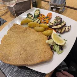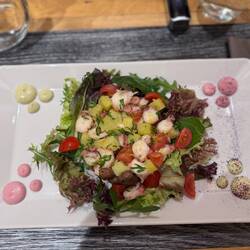 I bump into SSJW heading down to the restaurant. Transalpin has a stellar reputation for their food, and I’m very excited to try it. We order carafes of wine that are 1 litre - one of rosé, one of red. We order food. Lots of it. My starter is a brilliant octopus and potato salad. I love octopus. When it’s done properly, I think it’s the equal of any seafood out there. I’d take it over lobster any day of the week. It’s a brilliant dish, garnished with some interesting ‘blobs’ of sauce - one of which Jamie declares to be octopus sperm. Irrespective, it’s delicious. I think it’s a high-end tarama myself, but what do I know?