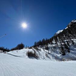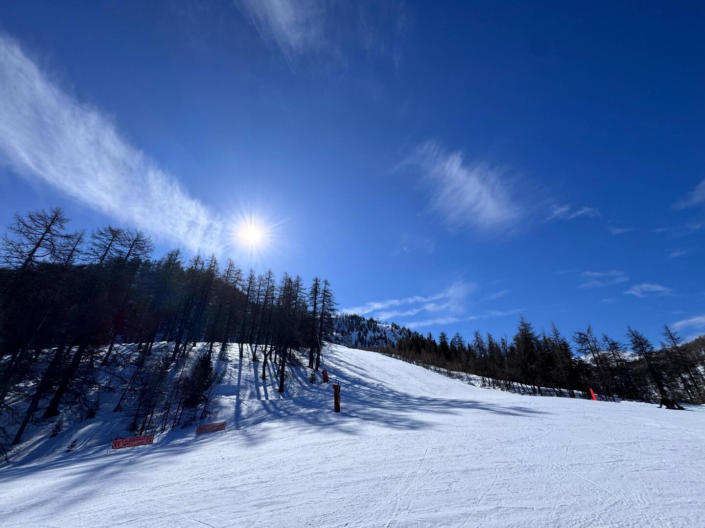 It’s been COLD overnight. Weather app reckons down to around -8C. As a result, the groomed pistes are hard frozen at the start of the day. When pistes are icy, you have to work that bit harder as the edge of your skis doesn’t cut into the surface as easily when you turn. The first couple of runs are a little sketchy. I head over to the other side of the valley, which has been basking in sunshine for the a couple of hours, and find absolutely perfect conditions. The surface ice has broken, and there’s a light, powdery texture to the snow. I spend an amazing hour criss-crossing the valley on a range of different runs.