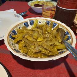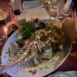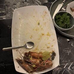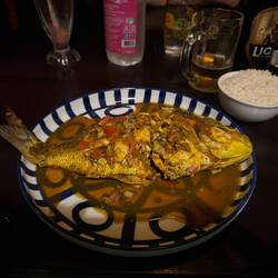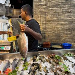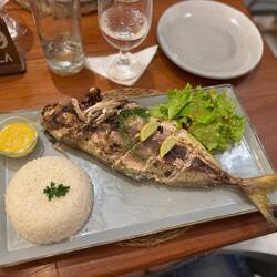 When our food arrives, it’s stunning. The grouper is delicious. A slightly softer and creamier texture than I’d perhaps expected, but perfectly cooked and ultra juicy. Vicki and I are pretty good at scavenging for some of the best parts. The cheeks and throats on fish this size are always a treat. The slightly chewy and crispy bits around the shoulder are fought over. At one point, one of the waiters moves to take away the fish head, and I emit something approaching a feral snarl, telling him I’m not done with it yet. It’s served with a super hot chilli sauce on the side which is as hot as advertised, and brilliantly tasty. I everso slightly overdo it at one point, and give myself the chilli hiccups. Sami, the manager, tells me it’s very simple to make - puréed green chilli with fish sauce, minced garlic, a squeeze of lime, and quite a bit of ground green peppercorn. I’d worried the flavour would dominate the fish, but it complements it wonderfully. I’m deffo having a pop at making it back in the UK.
