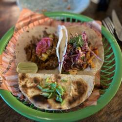 We organise ourselves with S+S to head out for dinner, and decide to hit up a very well reviewed Mexican place. It’s super busy when we arrive, but the team kindly sort us out a table. It’s Taco Tuesday, and their tacos are on a cheap deal. It also explains why it’s quite so busy. The tacos are excellent. Vicki and I both have 1 x birria beef, 1 x pork pibil, and 1 x Baja fish. The beef is probably the standout, but all are excellent. Shenda’s particularly excited that they have a good selection of veggie options.
