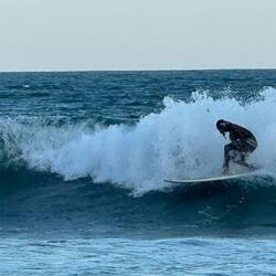 We quickly settle in. Beers arrive, food is ordered, one surfer nearly decapitates another with her surfboard. Of such things will our days be made. Food is delicious. A Nasi Goreng for me, and a fish burger for Vicki. Both hit the spot.