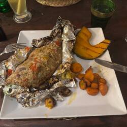 Vicki has a chargrilled fish - something that looks like a Dourade, and tastes similar. SO tasty. Shenda has a prawn curry which looks amazing, but which I don’t taste. Simon has a burger which is tantalising to look at. Our meal feels like great value - well under £20 a head. We meet an ultra cute kitten, who is skinny beyond belief, super friendly, and really just hanging out with us to encourage food…