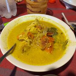 It starts out friendly enough, but the chillies and chilli powder seem to have sunk to the bottom of the coconut shell in which it’s served. As I scrape around at the bottom with some leftover bread, my mouth explodes. I have the chilli hiccups instantly. I perspire. I want dairy products instantly. And I am more than embarrassed as my tray is taken away, when our server tells me that my bowl was only ‘medium’ spicy.