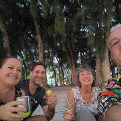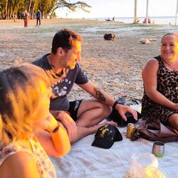 Sitzen am Strand 🏖️ von Flic en Flac um den Sonnenuntergang 🌅 mit Melissa und Ryan in voller Länge zu genießen. Ein, zwei Dosen Bier 🍺 für Ryan, Weinchen für Melissa, Markus und mich.