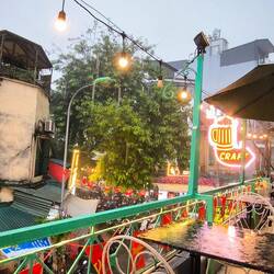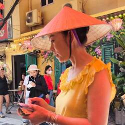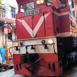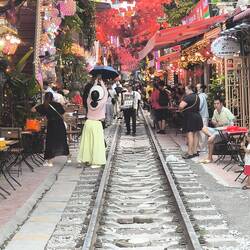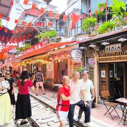 Zuerst entdecken wir die "Train Street", Hanois Zugstraße. Farbenfrohe Häuser und gemütliche Cafés säumen die schmale Gasse 🛤️, deshalb gönnen wir uns hier eine kurze Pause.