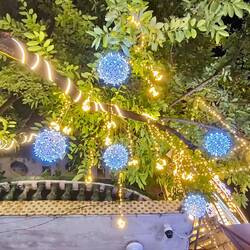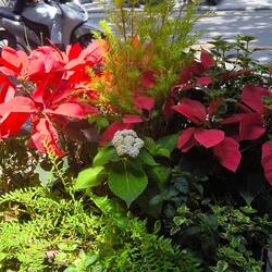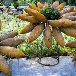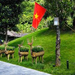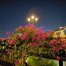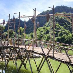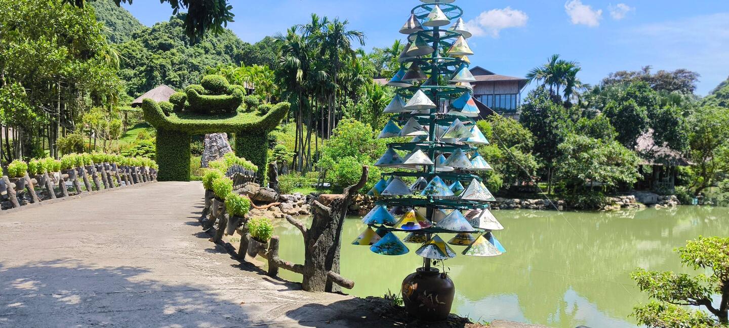 Am Brückenanfang bunte vietnamesische Hüte in Form eines Tannenbaums montiert. Die Brücke gesäumt von Blumentöpfen 🌼, am anderen Ende ein Eingangsbogen aus geschnittenen Hecken 💚.