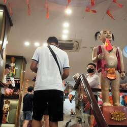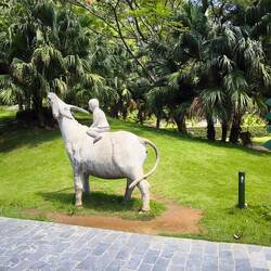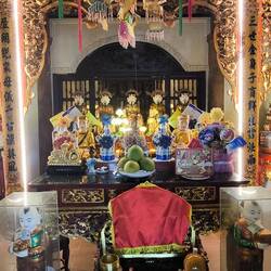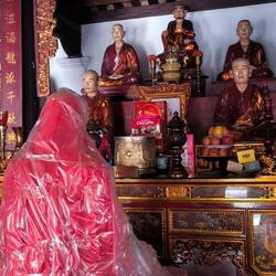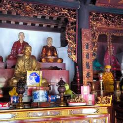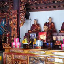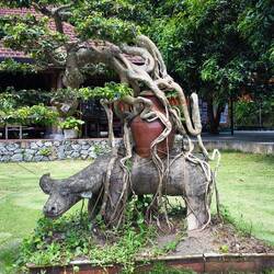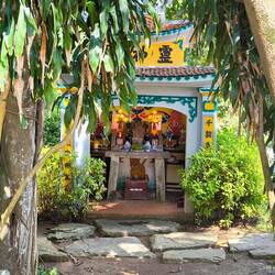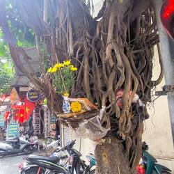 Solche Bäume werden in Vietnam oft mit Schutzgeistern 🧝♀️ in Verbindung gebracht. Direkt unter dem Baum 🌳 ein Schrein mit einem bemalten Tiger 🐯 auf dem Altar. Er deutet darauf hin, dass ein Wächtergeist 😇 verehrt wird, der den heiligen Banyanbaum beschützt.