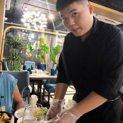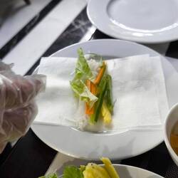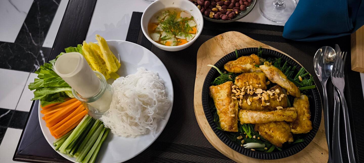 Zutaten: Reispapier, Reisnudeln 🍜, gestiftelte Salatgurke 🥒, Karotte 🥕, Ananas 🍍, kleine Salatblättchen , gebratener Fisch 🐟, geschmorte Frühlingszwiebeln, geschmorter Spinat🥬, Erdnüsse 🥜 und eine spezielle Dipsauce namens "Nuoc Cham". Diese besteht aus Fischsauce, Zucker, Limettensaft 🍋🟩, Knoblauch 🧄und Chili 🌶️.