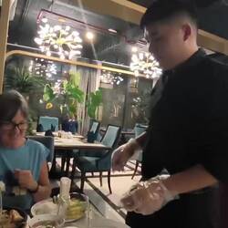 Der Kellner macht' s vor 🤗..., Tina macht's nach..., DA braucht's noch ein bisschen Übung 😃.