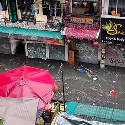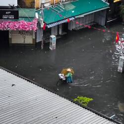 Der Taifun "Kajiki" lässt es in Hanoi regnen. Als wir nach dem Aufstehen aus dem Fenster schauen, sehen wir, wie die Menschen durch kniehohes Wasser 💦 waten. Moped- 🛵 und Radfahrer 🚲 müssen ihr Zweirad schieben 😲, die paar Autos 🚘🚖, die sich wagen durch die Straße zu fahren, kommen nur langsam vorwärts. Wahrscheinlich drückt sich das Wasser durch die Einstiege der Wagen.
