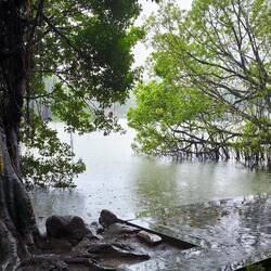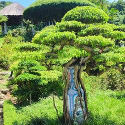 Wir erreichen einen uralten Banyanbaum, der sich alle dreihundert Jahre mehr als zehn Meter "bewegt".