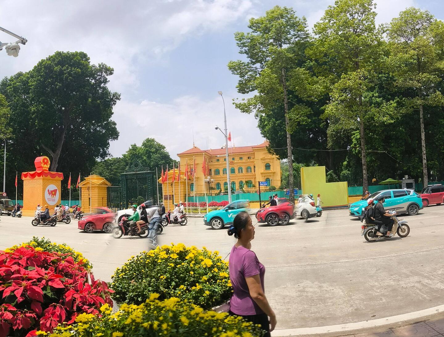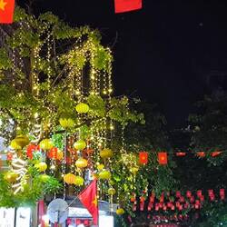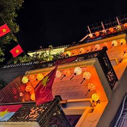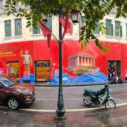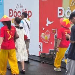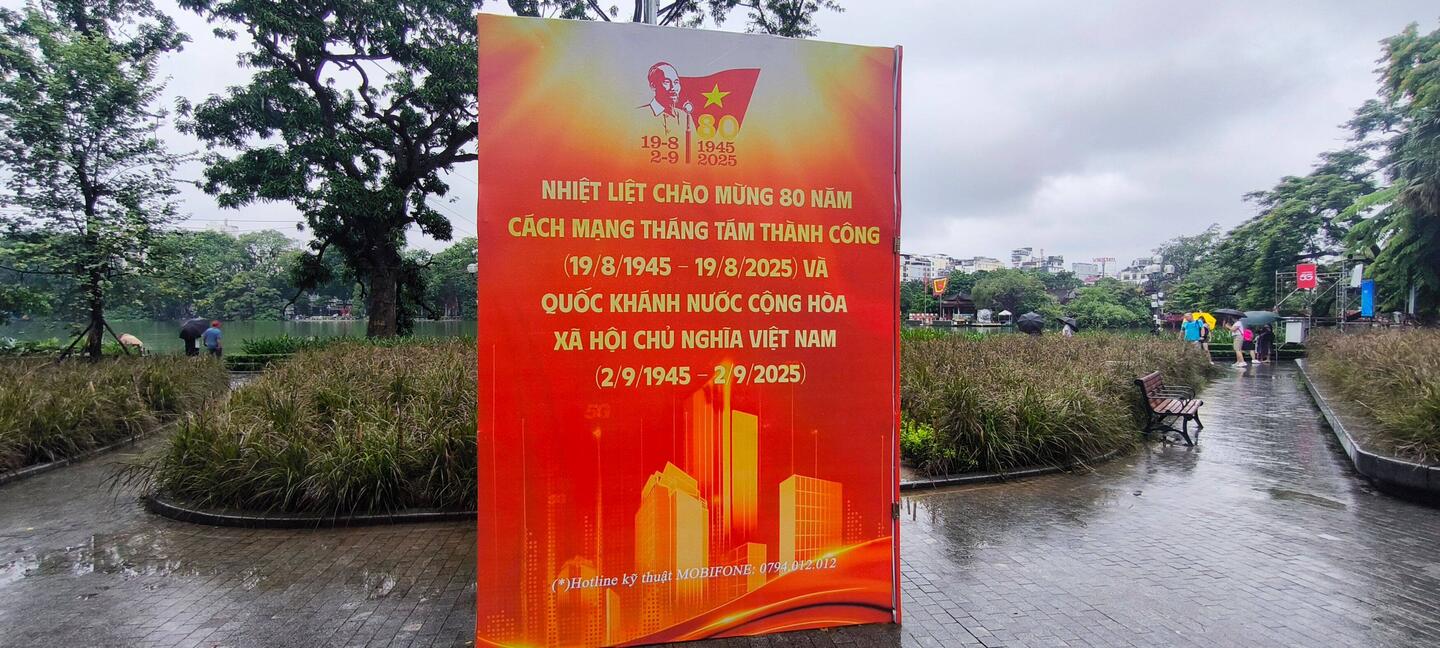 An jeder Ecke wird auf den 80 igsten Nationalfeiertag am 2. September 2025 hingewiesen, viele Vietnamesen zeigen sich mit ihrer Kleidung oder einem mit der Nationalflagge bemalten Gesicht solidarisch.