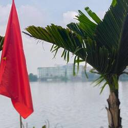 Eine Hubschrauberflotte 🚁 mit der National- und Parteiflagge fliegt über den Hoan-Kiem-See, quasi vis-á-vis an unserem Frühstückstisch vorbei. Weiter in der Ferne führen Kampfjets der Luftwaffe Trainingsflüge durch.