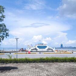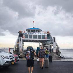 Punkt acht werden wir von einem Bus 🚍 an der Straße aufgegabelt. Es hat angefangen zu regnen 🌧️. Ein weiterer Stopp an einem Hostel bevor es zum Pier geht. Sieht so aus, als würden wir diesmal mit dem Bus aufs Schiff ⛴️ gehen.