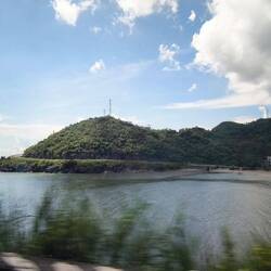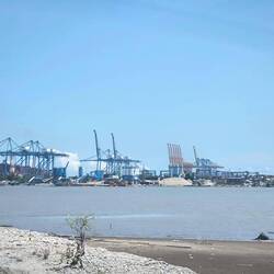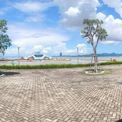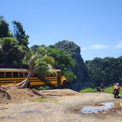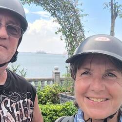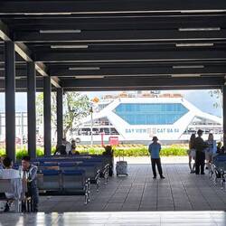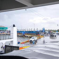 Auf dem Festland angekommen, sammeln sich alle um den Tourguide, der uns aufs Schiff begleitet hat. Er führt uns gegenläufig zur Fahrbahn auf dem Kai, zu einem Unterstand, weil es regnet 🌧️. Schwierig mit dem Gepäck, denn hier stehen Laster 🚚 Busse 🚌🚐 und Autos 🚘 mit laufenden Motoren..., und Mopedfahrer, die auch auf die Fähre wollen, quetschen sich hupend zwischen uns und den wartenden Fahrzeugen.