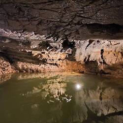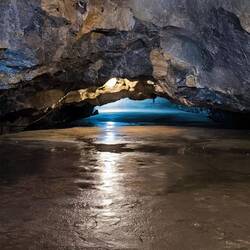 Die Höhlendecke wird immer niedriger, zuerst reicht es, wenn wir uns ducken, später zwingt uns die Tiefe der Decke, fast auf allen Vieren zu gehen. Markus muss umkehren, seine Bandscheiben machen nicht mit.