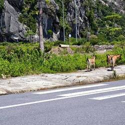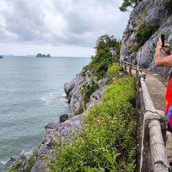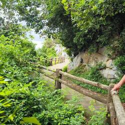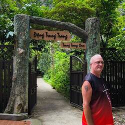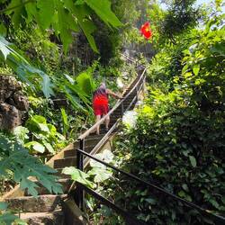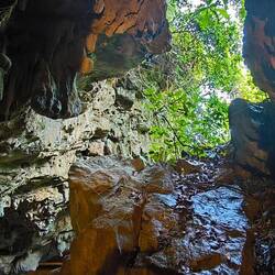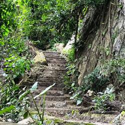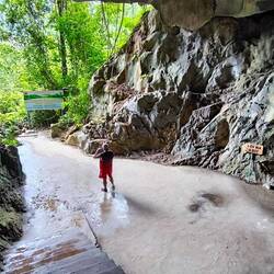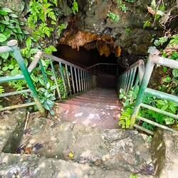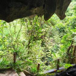 Ein geteerter Dschungelpfad führt uns zu einem Aufgang mit vielen Holztreppenstufen 🪜. Ganz schön drückend die Luft hier unter dem Blätterdach des Dschungels 😰, deshalb immer mal ein Päuschen zwischendurch, bevor wir den Eingang der Höhle erreichen.
