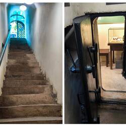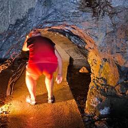 Ich begleite ihn noch zurück zur Treppe, die aus der Höhle 🦇 führt, danach tapse ich wagemutig in gebückter, teilweise gehockter Stellung über den schwimmenden Holzsteg. Gerade wenn ich denke, jetzt kann ich wieder aufrecht stehen, kommt der nächste Überhang, die nächste enge Passage.