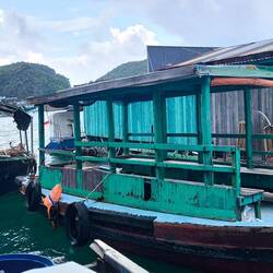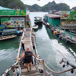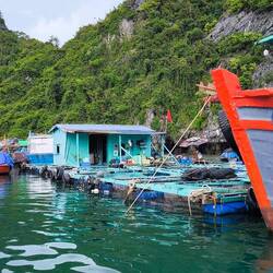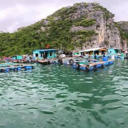 Unweit vom Pier das schwimmende Dorf "Cai Beo" 💦🏘️💦, welches wir auf dem Weg in die "Lan Ha Bucht" (die kleine Schwester der Halong Bucht) passieren.