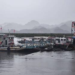 Große Fähren legen an und ab, aber wir sitzen immer noch wartend im Bus und harren der Dinge, die da kommen. Dann plötzlich die Aufforderung vom Tourguide, den Bus 🚍 zu verlassen und mit unserem Gepäck 🧳🎒 auf die Fähre zu gehen. Auf dem Festland stünde uns ein anderer Bus für die Weiterreise nach Ninh Binh zur Verfügung.