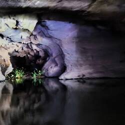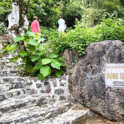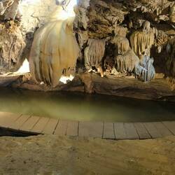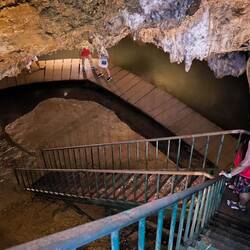 Sieht so aus, dass wir in unmittelbarer Nähe unseres Standortes 📌noch eine Höhle besuchen können. Es ist die "Dong Tien Ca" 🧜♀️ (Meerjungfrau-Höhle). Erstmal Steintreppen hoch zum Höhleneingang, dann eine Eisentreppe runter um in die Höhle zu kommen. Noch bevor wir den Boden betreten..., WOW 🤩..., ein unterirdischer Fluss und ein Bohlenweg