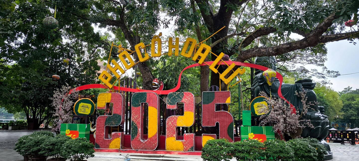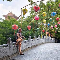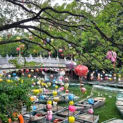 aber wo müssen wir jetzt hin? Zurück auf Start..., wir laufen zu der Stelle an der Googlemaps uns signalisierte, angekommen zu sein. Da hinten unter dem Baum🌳stehen große bunte 🎨 Buchstaben und wir meinen etwas von "Hoa Lu" zu lesen. Direkt dahinter ein See, jede Menge Paddelboote 🛶, die mit bunten Lampions 🏮geschmückt sind, eine Brücke führt zu einer kleinen Insel. Ob sich dort die antike Hauptstadt Hoa Lu befindet 🤔?