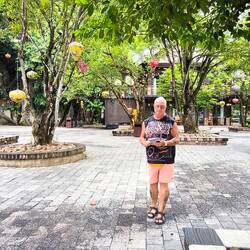 Der Regen 🌧️ wird stärker, vorsichtig steige ich die im Hang gebaute Treppe hinab und treffe Markus auf der Terrasse des Cafés. Überlegen, ob wir sofort ins Hotel 🏨 rollen 🛵 oder noch durch die Fußgängermeile entlang des Flussufers laufen sollen. Ach..., warum nicht mal einen Blick in die "Walking Street", die durch einen bunten Bogen sehr einladend aussieht, werfen ⁉️ Ein Bereich zum Spazierengehen 🚶♂️, Einkaufen 🛍️und Essen 🍽️.