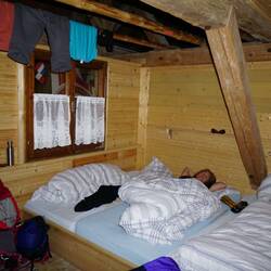 Immer noch waren die Wetteraussichten für den Samstag schlecht, dennoch brachen wir am frühen Abend zur Gehrenalpe auf. Die immer noch schwül-heiße Luft und der schwere Rucksack setzte uns ziemlich zu. 600 Höhenmeter später, saßen wir dann bei erfrischender Apfelschorle auf der Terrasse der Alm. Da uns für diese Nacht ein Lager für uns alleine angeboten wurde, entschlossen wir uns nicht wie geplant draussen zu schlafen. Die Schlaflager sind echt urig und haben keine Decke, so dass man direkt auf den Dachstuhl der fast 100 Jahren alten Alm blickt.もっと詳しく