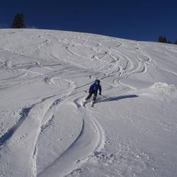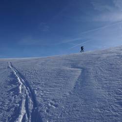Nach einer kurzen aber aussichtreichen Rast am Gipfel hatten wir bis auf ein paar windgepresste Stellen einen wunderbaren Schnee bei der Abfahrt.