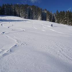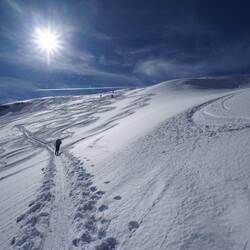 Auch wenn die Schneeauflage durch die Wärme schon etwas gelitten hatte, fanden wir dennoch eine schöne "Spur" für unsere Abfahrt.