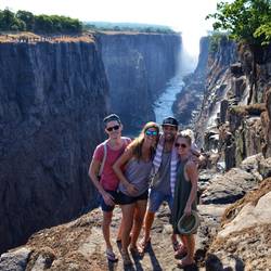 Dann geht alles ganz schnell. Afrika-Felix‘ Kumpel weist uns geübt an, welche Posen wir einnehmen sollen für die obligatorischen Fotos. Bei einer Pose lehnen wir bäuchlings über die Kante, die Arme frei segelnd über der Schlucht. Dabei kann man bis ganz auf den Grund der Viktoriafälle schauen. Den einzigen Halt gibt Afrika-Felix, der uns an den Füßen hält. Adrenalin pur!!